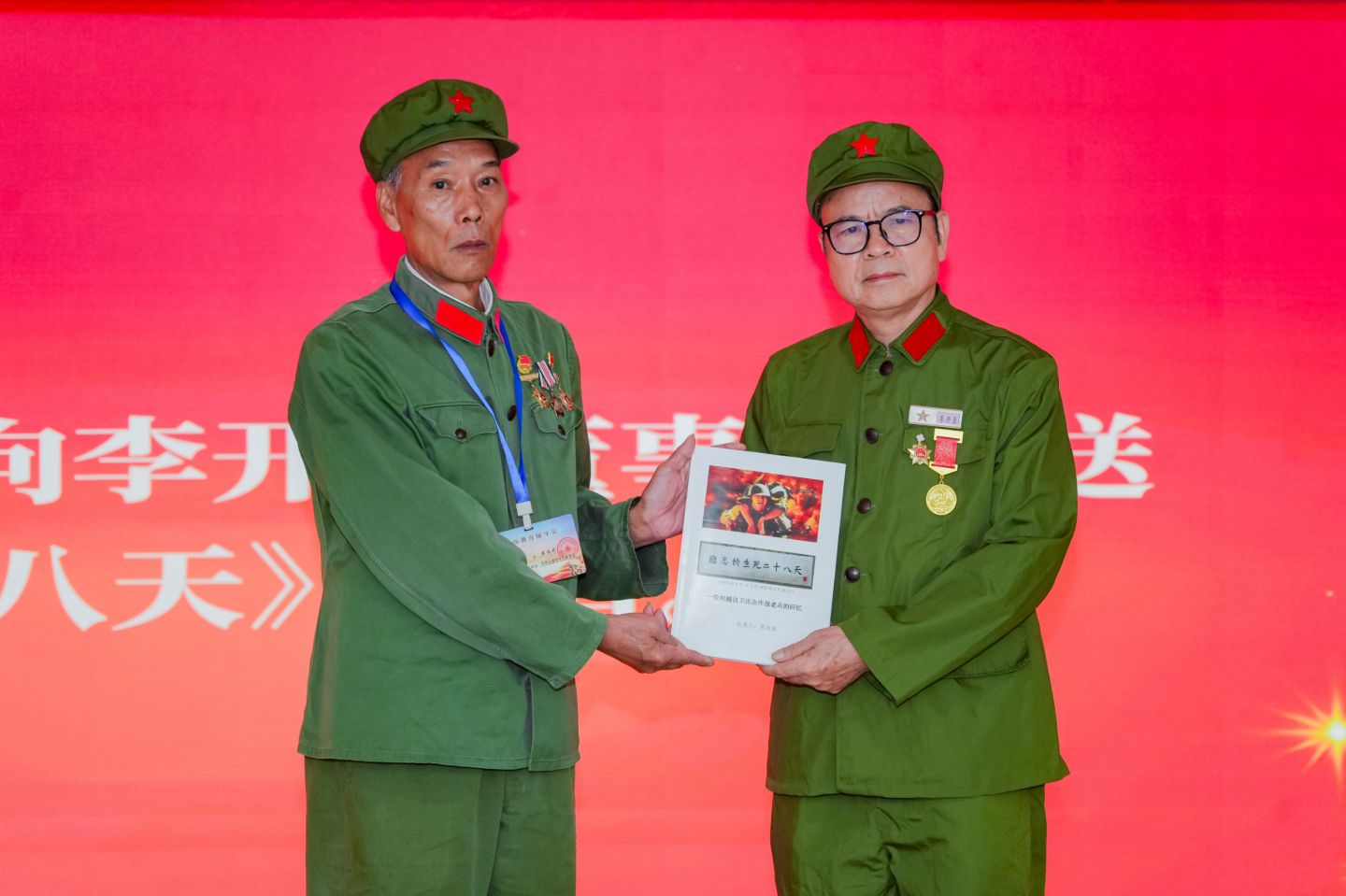 講座現(xiàn)場,溫情與敬意交織。董事長代表公司向吳運武同志及其夫人敬獻鮮花,馥郁花香中,是對英雄及家屬的深切感恩。更動人的是“戰(zhàn)友互贈”環(huán)節(jié)——吳老將親筆撰寫的戰(zhàn)地日記《難忘的生死二十八天》贈予董事長,字里行間滿是硝煙中的堅韌;董事長則以墨寄情,將手書的七律詩與《贊軍嫂》現(xiàn)代詩相贈,一筆一劃皆是對戰(zhàn)友的敬仰、對軍嫂的禮贊,當《贊軍嫂》的朗誦聲響起,真摯情誼令在場者無不動容。